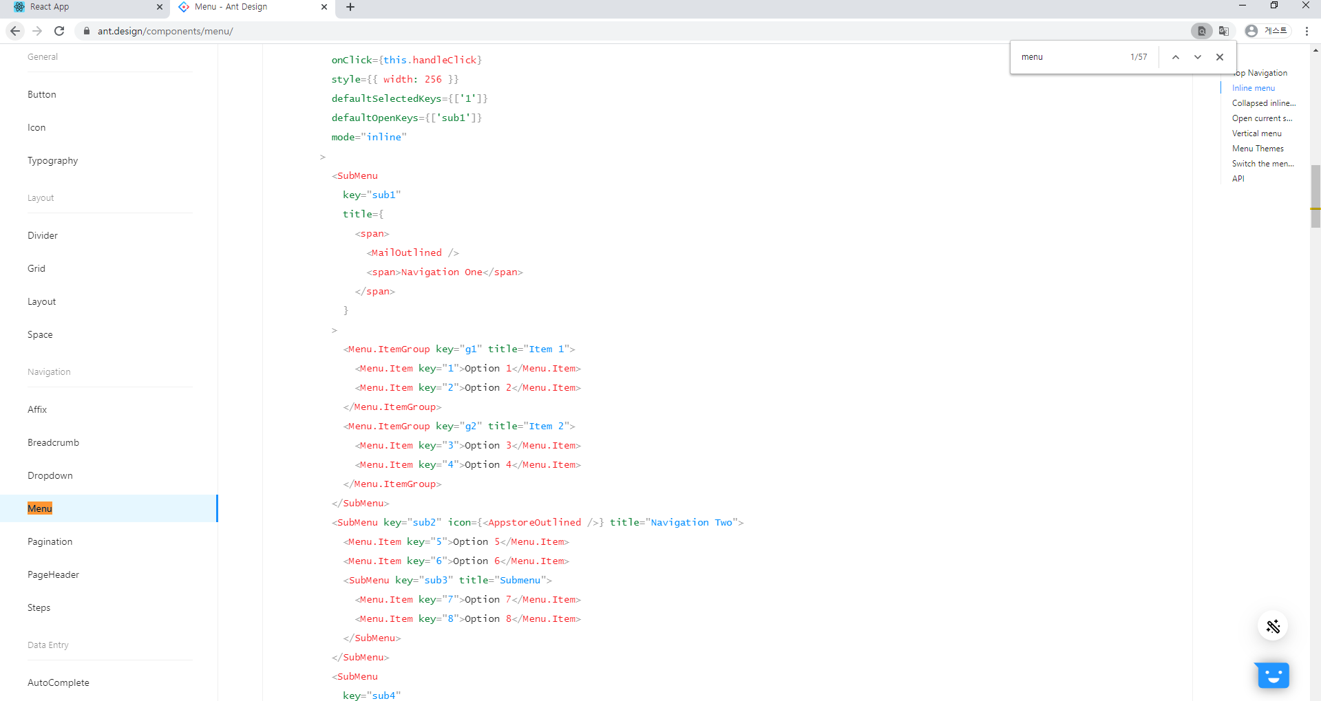 가장 첫 번째 나오는 Menu컴포넌트의 코드를 보고 내용을 확인하시길 바랍니다.