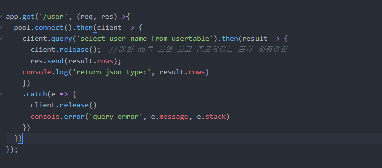 받아준 result 값을 send 해주면 내가 선택한 경로에 result.rows 열들의 값이 json타입으로 입력됩니다.