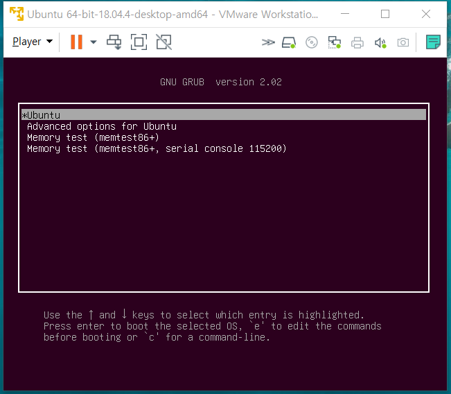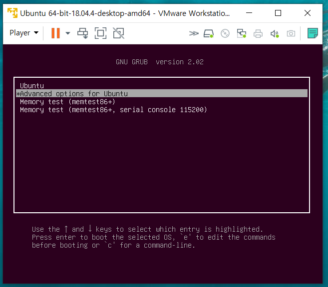 1. 부트로더 GRUB의 첫 화면이 나옵니다. 아래 메뉴에서 2번째 옵션을 선택해줍니다.