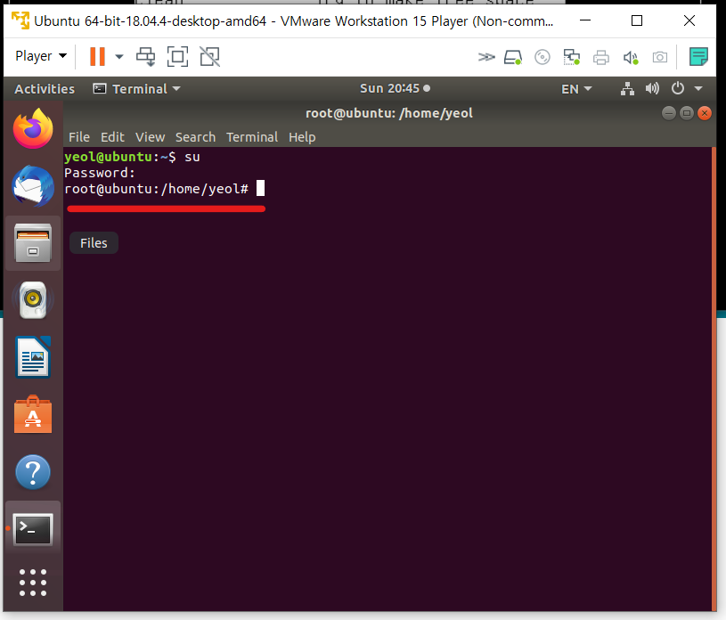 root 계정을 접속하기 위해 su 명령어와 비밀번호를 입력해줍니다.