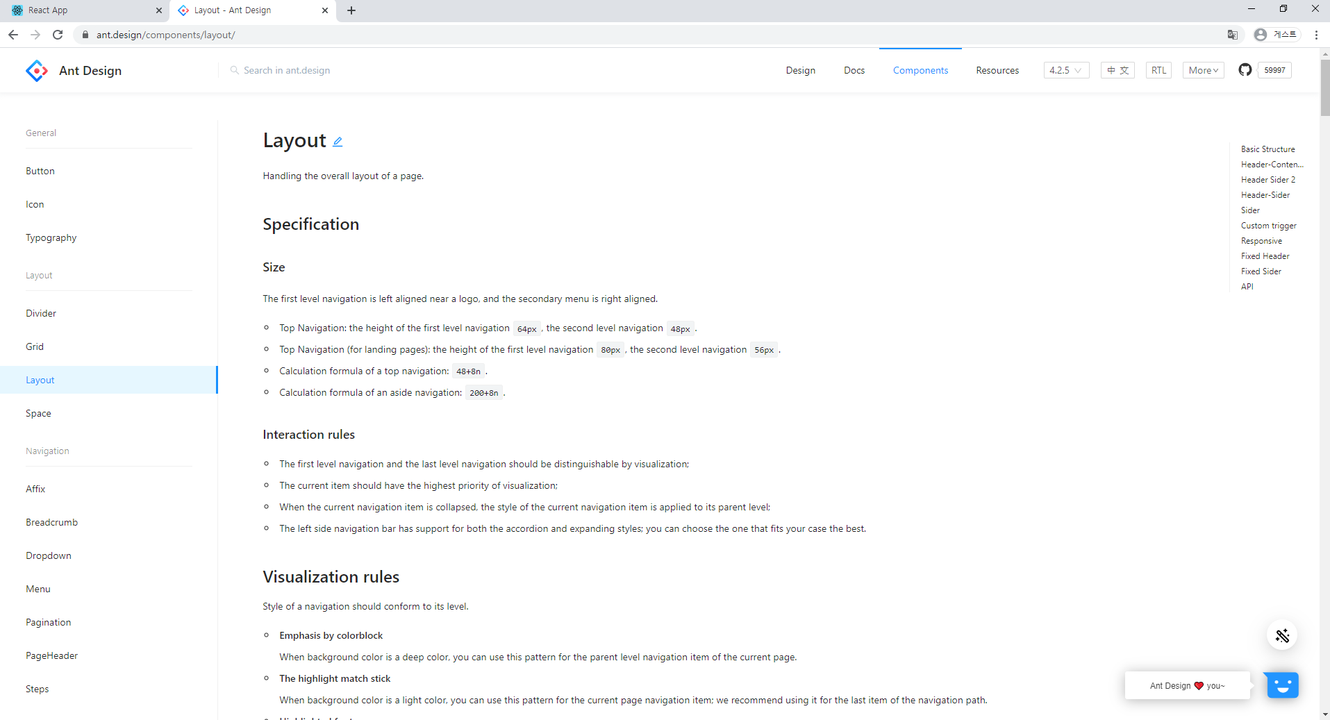 밑의 url사이트는 ant사이트에서 components를 바로 누르면 나오는 상태입니다. 버튼이 가장 먼저 등장합니다.