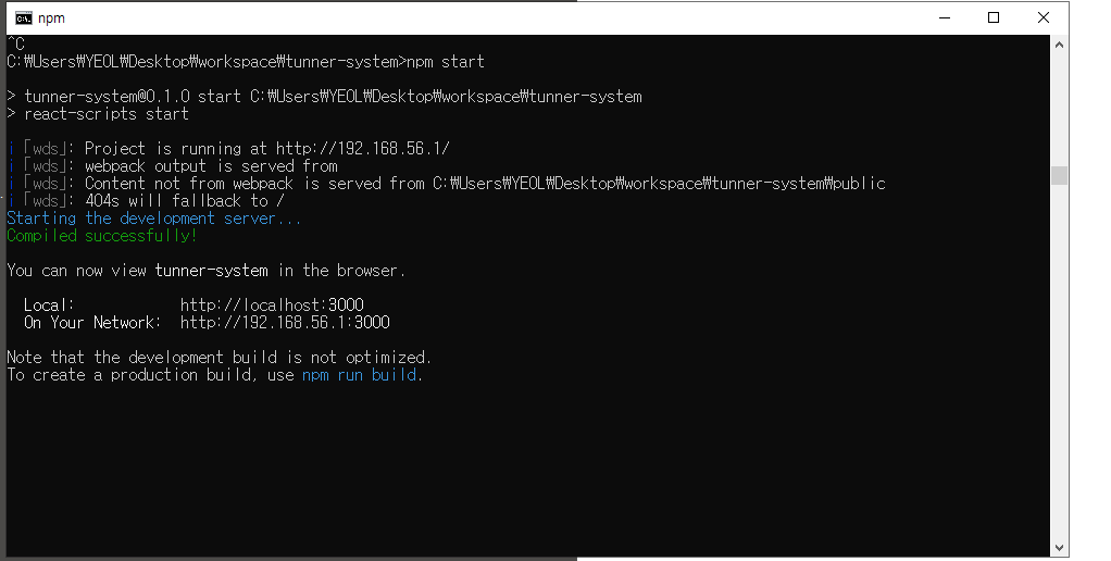 후에 명령 프롬프트에서 본인이 app을 설치한 위치를 찾아 npm start를 실행해주시면 됩니다.
