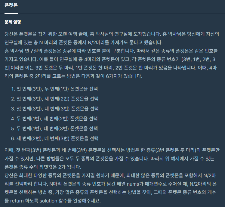 포켓몬을 N/2만큼 가져갈수있고 단 종류별로 하나씩이라서 3번 포켓몬이 3, 3, 3, 3 이렇게 4 마리 있으면 1마리만